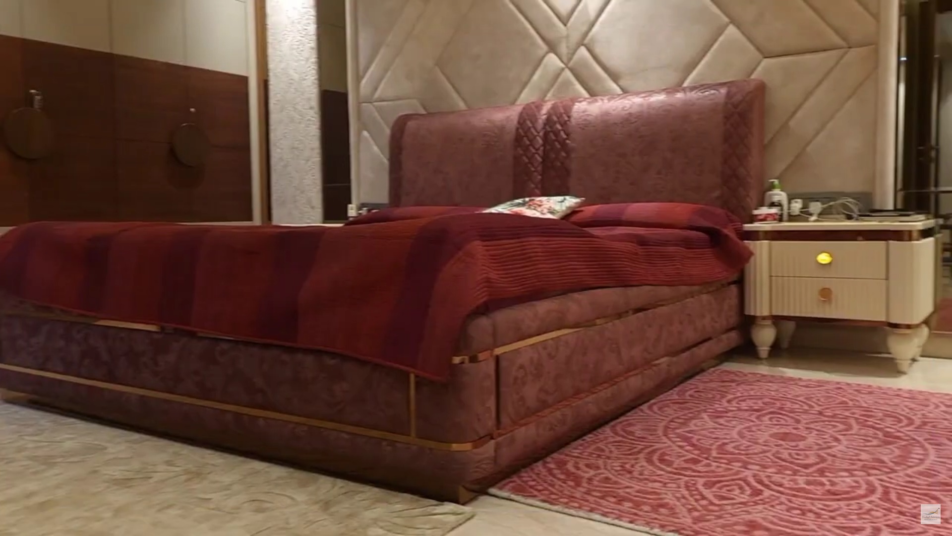 Bed back wall in fabric, glass and metal |